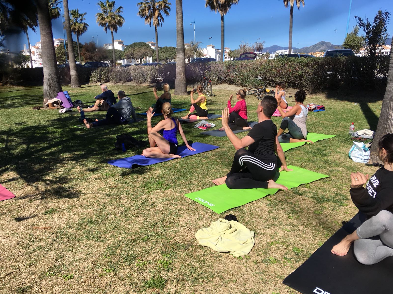The setting is, of course, stunning. Exercising on the grass below the palm trees by the seaside promenade in San Pedro with the blue skies above for only €5 euro.